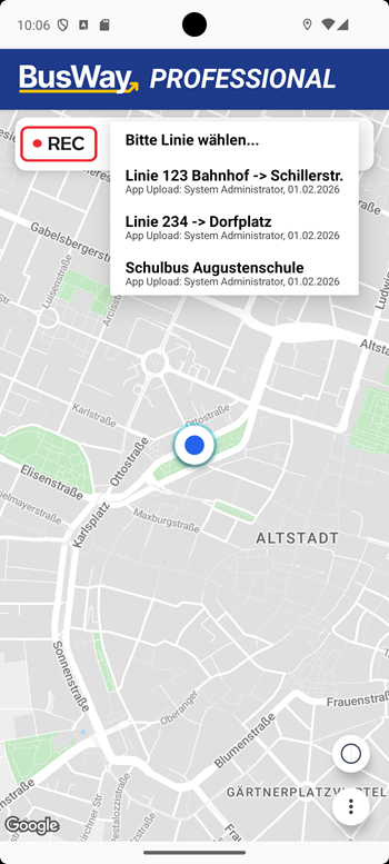 To start a trip, press the button "Please select route..." in the top bar of the home screen. Select the desired route from the menu that appears.